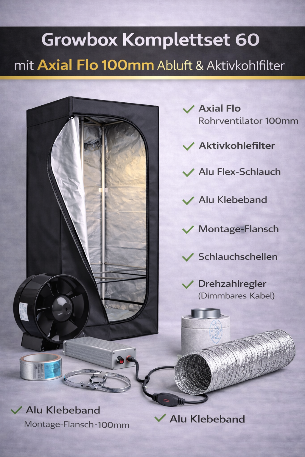 Growbox Komplettset 60 mit Axial Flo 100mm Abluft & Aktivkohlefilter